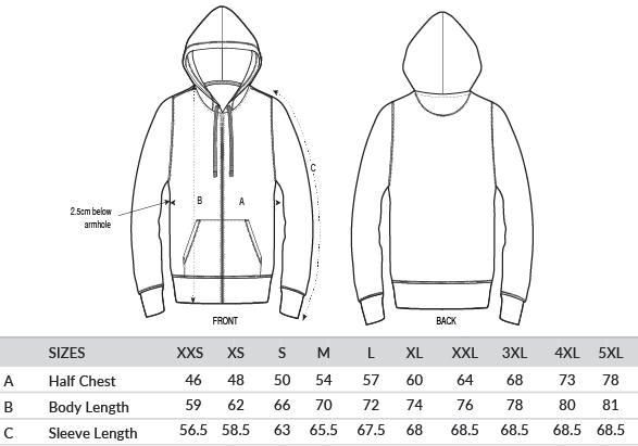 Set-in sleeves. Self-fabric lined hood. Flat drawcords in matching body colour. Embroidered buttonhole eyelets. 1x1 rib at sleeve cuffs and bottom hem. Kangaroo pocket with flatlock stitches. Exposed metal zip at centre front. Three-needle flatlock stitches on all seams. Herringbone tape at the inside back neck seam and inside of the zip. Self-fabric half moon at the back neck.