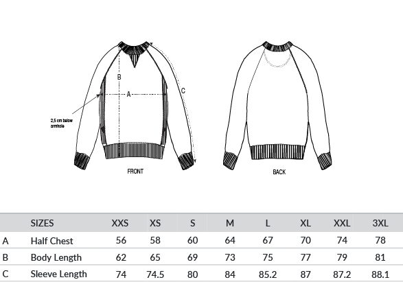 Raglan sleeves. 1x1 ribs at collar, sleeves cuffs and bottom hem. 1x1 ribs v-notch at collar. 1x1 ribs side panels. Two-needle topstitches at the collar, sleeve cuffs and bottom hem. Three-needle flatlock stitches at the raglan seam, side panel seams and v-notch. Inside back neck tape in herringbone. Self-fabric half moon at back neck.